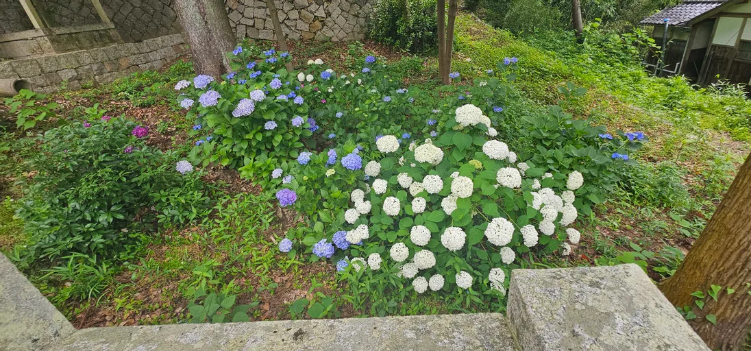 参道脇に色々とりどりの紫陽花が咲いてました。